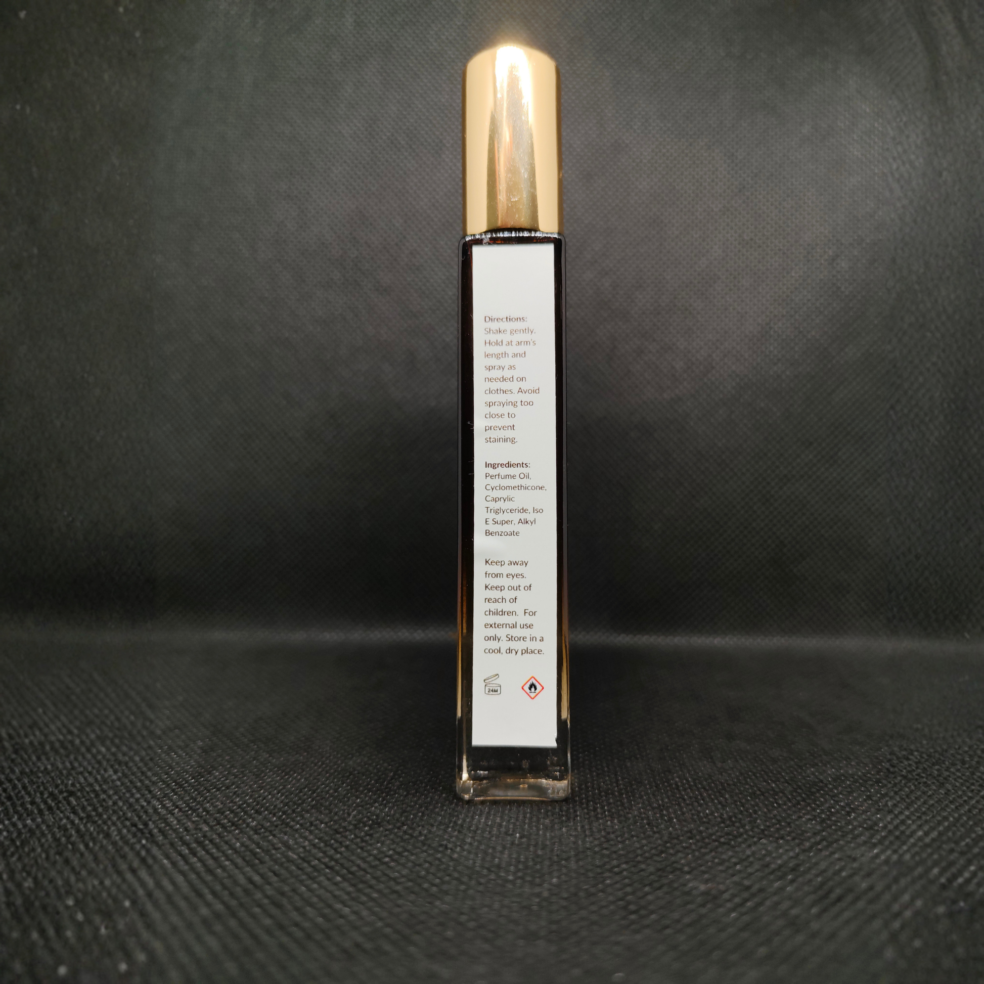 Perfume oil, Cyclomethicone, Caprylic Triglyceride, Iso E Super, Alkyl Benzoate.